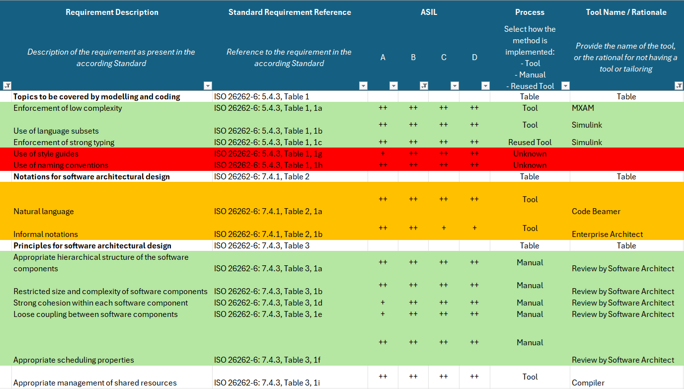 Custom Spreadsheet Assessment: The expert guides you through a specially designed spreadsheet that serves as a baseline to understand your case. This spreadsheet maps your current tools as well as the processes you use to cover the specific requirements of the ISO 26262 standard. For every tool, you can classify its state whether it is certified, it is a TCL1 tool with a safety manual, or an unclassified tool. An example of this spreadsheet is shown below.